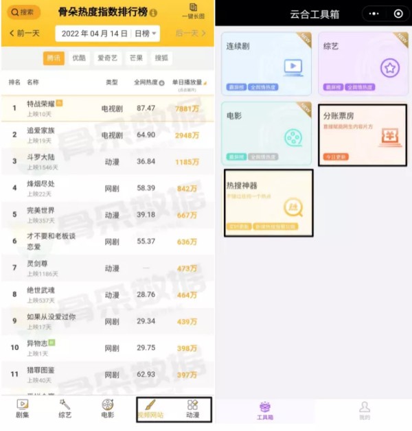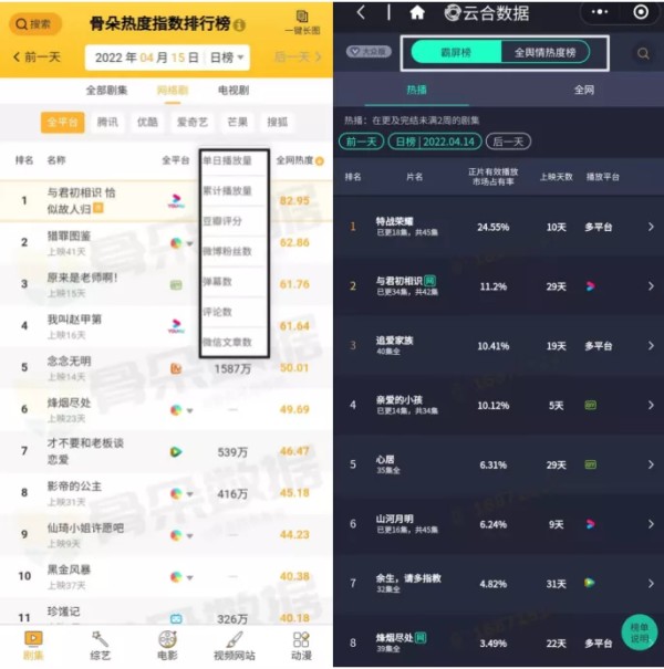 云合与骨朵,分别成立于2016年和2014年,正值网剧和网络电影方兴未艾之际。它们同样在网播领域深耕、同样有着操作便利的小程序、同样定期发布数据报告解读,以供从业者参考。所以在多数情况下,对于使用者而言,云合数据和骨朵数据可以相互支撑参考。