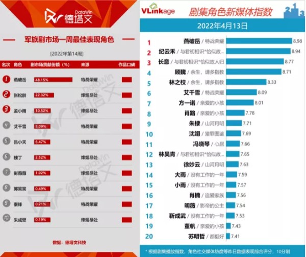 而在之前以明星榜单为主营内容的德塔文和Vlinkage,便率先抓住新风口,分别推出“一周最佳表现角色”和“剧集角色新媒体指数”两大榜单。
