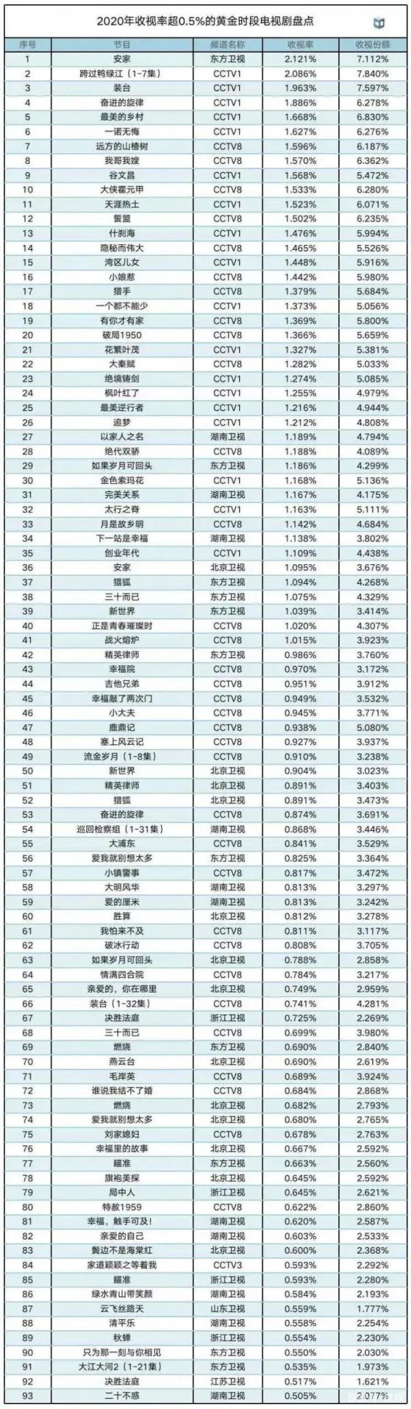 2020年过去了,各大机构也纷纷公布了2020年的收视率排行榜,其中,比较权威的“中国视听大数据”发布了2020年的电视率收视率排行,榜单发布也是引发很多争议,确实,这份榜单也是看点颇多: