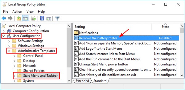打开本地组策略编辑器并导航至:User Configuration -> Administrative Templates -> Start Menu and Taskbar 双击拆除电池计”右窗格的政策,并将其设置为禁用。重新启动计算机以应用您的更改。