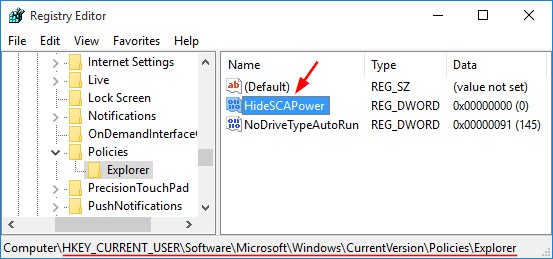 打开注册表编辑器并导航到以下密钥:HKEY_CURRENT_USER\Software\Microsoft\Windows\CurrentVersion\Policies\Explorer 寻找HIDESCAPOWER注册表编辑的右窗格条目。如果不存在,请右键单击空白处并选择新的- >dword(32位)值,然后将其命名为HIDESCAPOWER。 双击HIDESCAPOWER,并将值设置为0。(1:隐藏电池状态图标,0:显示电池状态图标)