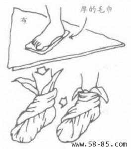 用一个厚的毛巾折叠成比脚板略大的矩形,垫在脚下,然后用布把脚裹起来,就做成了一双应急用的鞋子,如图所示,适合在脚上起泡时使用。