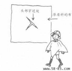找一块比较厚的布料,在其中剪出如图所示的裂缝,然后把头部从裂缝穿过,布料覆盖在身上,这样一件临时应急的雨衣就做成了,可以用色拉油涂满布面,使之具有防水效果。