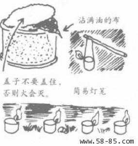 找一个开过盖的罐头盒之类的盒子,在里面放一块沾满油的布,使之充满盒子,然后把盖子压在布上,一个简易灯笼就做成了,点着火就可以用了,注意盖子不要完全盖住,否则火会熄灭。