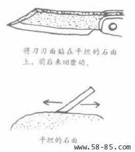在野外生存时,刀是及其重要的武器,最好随时保持锋利,当刀锋变钝时,找一个平坦点的石面,将刀刃面贴在平坦的石面上,前后来回磨动。