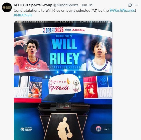2025年NBA选秀大会在6月27日至28日举行,KlutchSportsGroup得6名球员被选中。弗莱明·拉舍尔在次轮第31顺位被菲尼克斯太阳队摘走。蒂耶罗·科林斯在次轮第36顺位加盟洛杉矶湖人队。威尔·莱利在首轮第21顺位进入华盛顿奇才队。克里斯多夫·克莱顿在首轮第18顺位被犹他爵士队锁定,这位24岁的前锋刚以场均18.7分9.2篮板的成绩拿下NCAA年度最佳球员(MOP)。鲁卡·马鲁阿奇在首轮第10顺位同样加入太阳队,他是杜克大学的内线核心,选秀前联合试训表现抢眼。杨瀚森在首轮第16顺位被开拓者队选中,这名21岁的中国球员原本选秀预测只在次轮第40至50顺位之间。