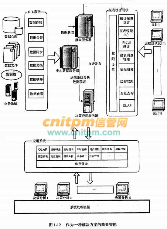 因此,把商业智能看成是一种解决方案应该比较恰当。商业智能的关键是从来自纽织的许多不同的运作系统的数据中提取出有用的数据并进行清理,以保证数据的正确性,然后经过抽取(extraction)、转换(transformation)和装载(load),即ETL过程,合并到一个组织级的数据仓库里,从而得到组织数据的一个全局视图,在此基础上利用合适的查询和分析工具、数据挖掘工具、OLAP工具等对其进行分析和处理(这时信息变为辅助决策的知识),最后将知识呈现给管理者,为管理者的决策过程提供支持,如图1-12所示。