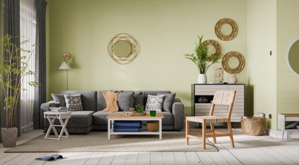 绿色可以营造出自然、清新的氛围。可以选择绿色的墙面、窗帘或沙发,搭配白色的家具和装饰品,打造出一个充满生机的空间。例如,绿色的植物图案壁纸搭配白色的木质沙发和白色的地毯,再加上一些黄色的花朵作为点缀,整个空间充满了活力。