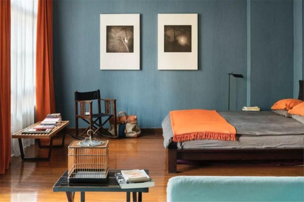 第八种是橘红色配木色,橘红色会让人觉得很难搭配,的确是这样。桔红色你用不好,它的视觉冲击会非常强,太鲜艳的颜色看多了会让人感觉很不舒服。但是,橘红色搭配木色是一个不错的选择,前提这个橘红色它的这个明度要暗,然后搭配非常纯净的木色。花纹切记不要太多,然后木色不能太深这样会呈现出一个非常现代,又极具未来的感觉,在橘红色和浅木色这样搭配的空间里。用什么颜色来点缀比较好呢?我个人是比较推荐白色的,比如说白色的灯具,还有就是留白多的一些挂画,又或者是一些白色系的家具。这样的话会让整个空间更加有现代的感觉。切记不要用碎花,这种花纹太繁复的软装,这样的话会把整个格调再往下拉一下的。