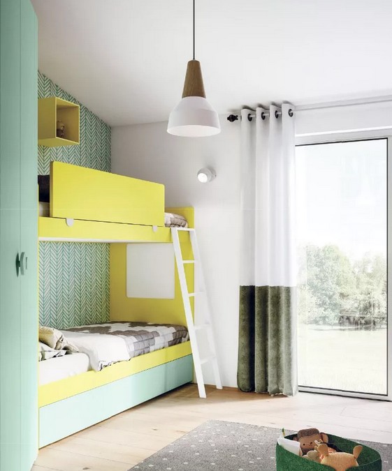 墙面刷成大面积的淡黄,选择偏蓝色的床品,绿色系窗帘,视觉温度刚刚好。