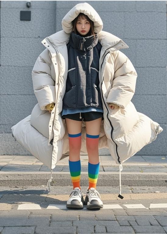 先说那种超大号羽绒服搭短裤和长筒袜的穿法。大冬天的,羽绒服大得能把人整个包起来,下面却是短裤,再配上彩色长筒袜和厚底运动鞋。一开始您可能觉得怪,可看久了就会发现,这上面捂得严严实实,下面露着腿,对比起来还挺有意思,又保暖又有个性。
