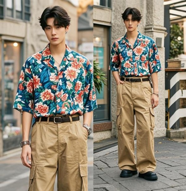 还有那种复古花衬衫配工装裤的。花衬衫那图案可鲜艳、可夸张了,再搭条宽松的工装裤,腰上系条个性皮带。刚看那花衬衫可能觉得太花哨,可跟硬气的工装裤一搭,刚柔并济,越看越觉得有味道。