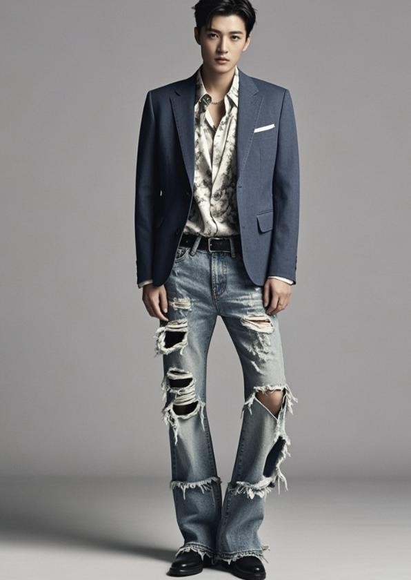 破洞牛仔裤和正装上衣的组合也挺特别。牛仔裤破洞大破,膝盖、大腿那破得厉害,上面却穿件精致的正装上衣,像修身的西装外套或者丝质衬衫。一开始觉得这俩不搭边,可看久了就会发现,这种随意和正式的混搭,有种不羁又精致的感觉。