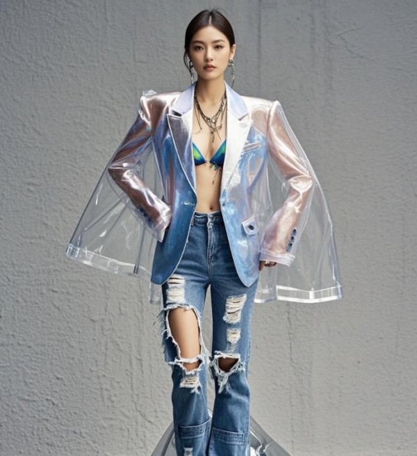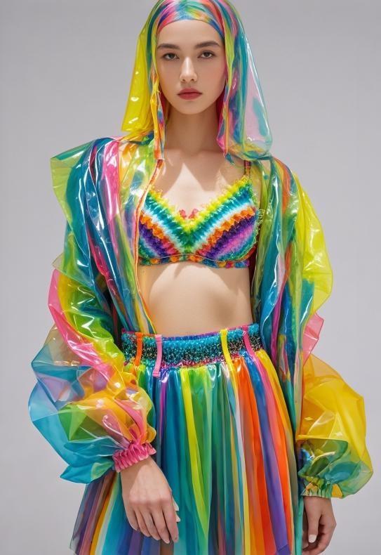 再有就是那种穿塑料材质衣服的。从头到脚都是透明塑料做的,里面穿件颜色鲜艳或者很有个性的内衣、打底衫。一般咱可不会这么穿,刚看觉得怪,可它那种独特的光泽和质感,还有那种未来感,多看几眼就会觉得也不错。
