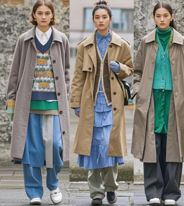 还有多层叠穿的。各种不同风格、材质、颜色的衣服一层一层套着,比如毛衣外面套马甲,再加上风衣,下面可能好几层裙子或者裤子。刚看觉得乱,可仔细瞅瞅,能发现里面的层次和小细节,能看出这人很有个性、很有创意。