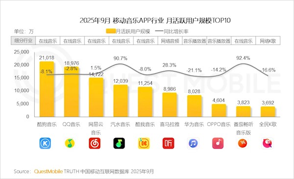 快科技11月7日消息,QuestMobile公布了2025年9月移动音乐APP月活用户规模TOP10榜单。
