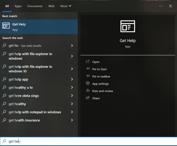 这个非常方便的帮助应用程序从Windows 10开始就可以使用了。要在您的计算机上找到它,请打开搜索菜单并输入Get Help。您也可以单击开始按钮,滚动浏览开始菜单左侧的所有应用快捷方式,然后手动 查找“获取帮助”。(Get Help)