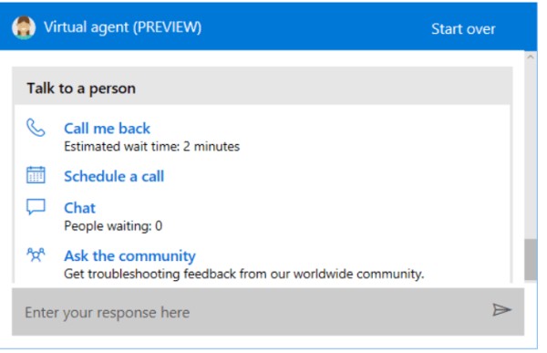 如果您不知道问题可能是什么,虚拟代理将无法帮助您。相反,请键入 Talk to an human 以获得Microsoft支持。这会将您连接到为Microsoft支持工作的真实人员。然后,在您指定虚拟助手没有帮助您之后 ,单击与人交谈。(Person)
