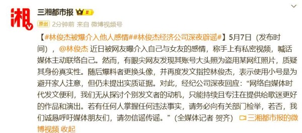 5月7日, 网络上传出林俊杰疑似介入他人感情的绯闻,有网友声称手握私密视频并公开喊话媒体,要求主动联系。然而,细心的网友发现该网友所使用的账号头像并非本人,而是盗用了某网红的照片,从而对其身份的真实性产生了质疑。随后,该爆料者更换了头像并再次发文,声称使用小号是为了避免家人的注意,但依然未能提供确凿的证据。