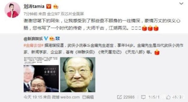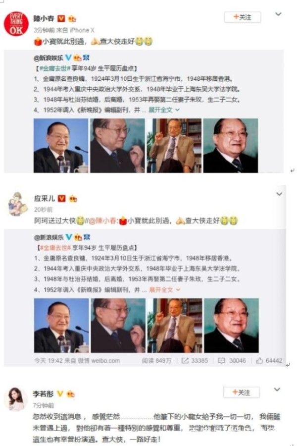 “侠客精神永存人间”,在《神雕侠侣》中扮演杨过的黄晓明写道;凭借着郭襄一角走红的杨幂一句“襄儿拜别”戳中了无数人的泪点;“谢谢您笔下的阿朱,让我感受到了那些奋不顾身的一往情深,豪情万丈的侠义心肠”,《天龙八部》中阿朱的扮演者刘涛写道;胡军也感慨“一挥手竟成永别”。
