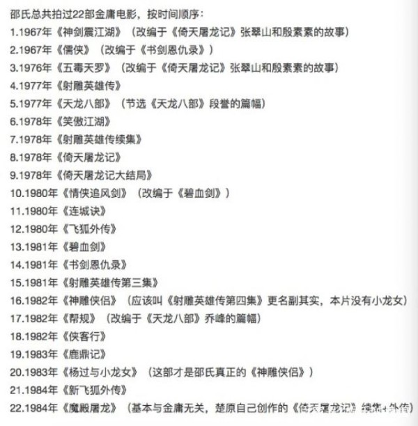 最早入局也是最具代表性的便是1958年成立的邵氏电影公司。据媒体统计,其曾出品了22部金庸电影(另一说为23部),双方合作时间更是从1967年延续到1984年,也拉开了金庸武侠电影的第一个黄金时代。