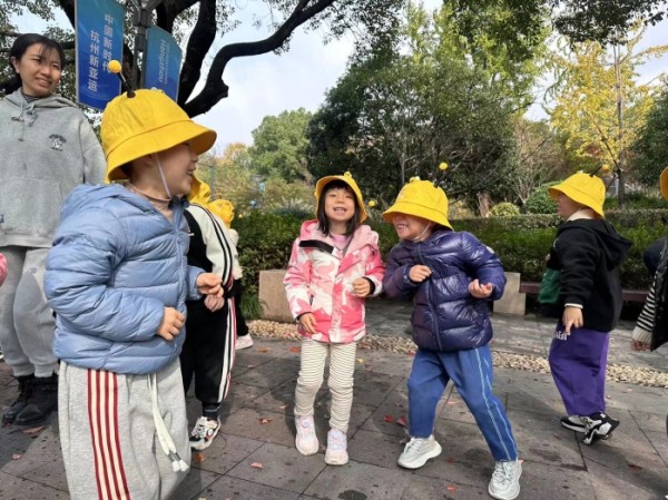 随后,小朋友来到林荫大道,一起玩起了《爱的抱抱》游戏。孩子们伴随着音乐随意舞动,当音乐暂停,听到老师口中的数字是几,就赶紧找几个小伙伴抱在一起,孩子们在秋日的暖阳下一起快乐的玩耍,共同感受着秋日的惬意与美好。