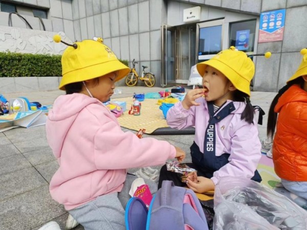 孩子们最期待的野餐环节到了,老师们在开阔的地面上上铺好了野餐垫,小朋友们围坐在一起,在大自然里进行野餐,还和好朋友互相分享了美味的食物呢!