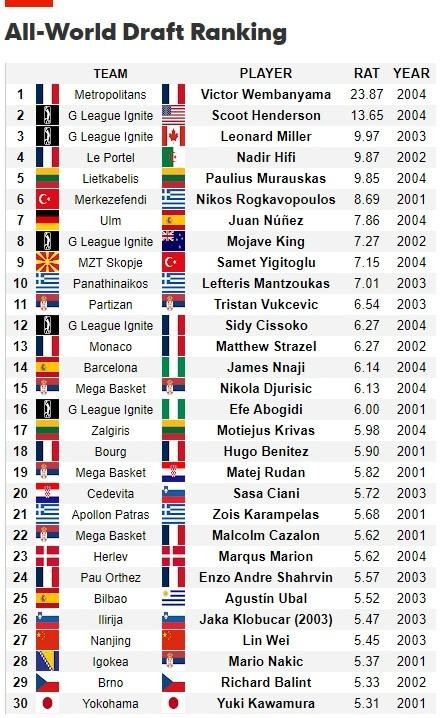 直播吧12月21日讯 美媒HoopsHype根据具有下赛季参选资格的球员在各大职业联赛中的表现制定了全球选秀排名,并评选出Top30,其中文班亚马排名第一,亨德森排名第二,他的队友莱昂纳德-米勒排名第3,中国同曦小将林葳排名第27。