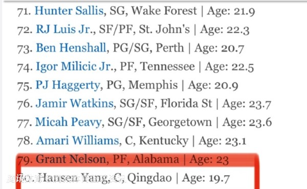 Tankathon更新2025年NBA选秀排名:杨瀚森上升一位排名第68