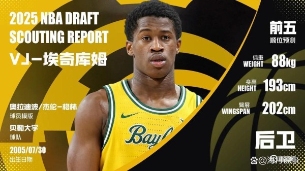 还有VJ-埃奇库姆那个亚裔男孩,站在话筒前还有点小紧张,背后贝勒大学校服的蓝黄配色,鲜亮得让人移不开眼。感觉他下场打球大概率是那种能突破、能助攻的节奏型后卫。