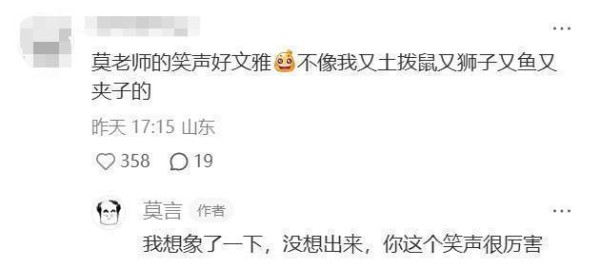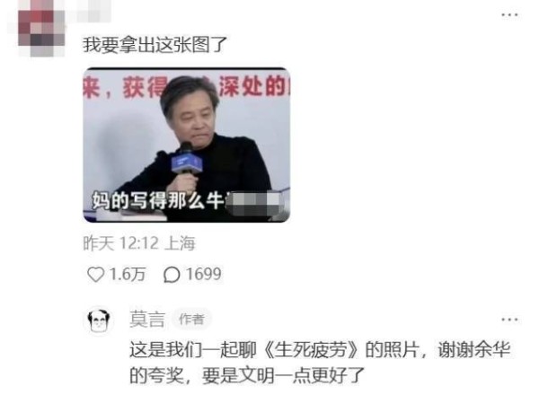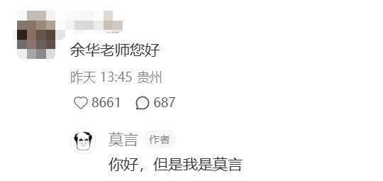 有网友评论:余华老师你好。莫言回复:你好,但我是莫言。