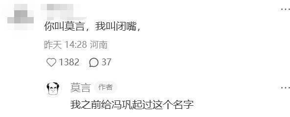 莫言还在评论区回复了给冯巩起笔名“闭嘴”一事,今年6月莫言在个人社交账号发文讲述给冯巩取笔名的故事,给冯巩取名“闭嘴”一度让莫言陷入忐忑和内耗,最后冯巩在社交媒体上把他俩对话的视频发出来了,让莫言心中石头落地。