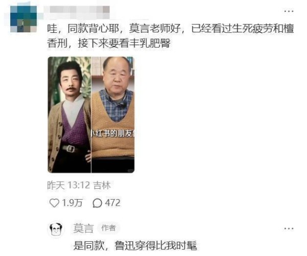 有网友晒出莫言和鲁迅的同款毛衣,莫言评价:鲁迅穿得比我时髦!