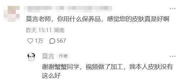 有人夸莫言皮肤好,实诚的莫言上线:视频做了加工,我本人皮肤没有这么好。
