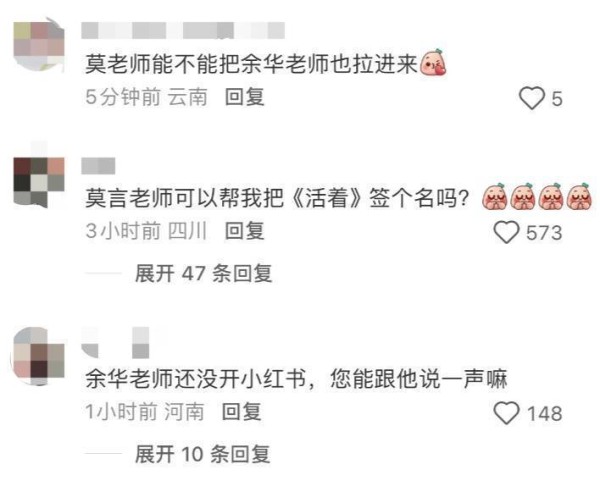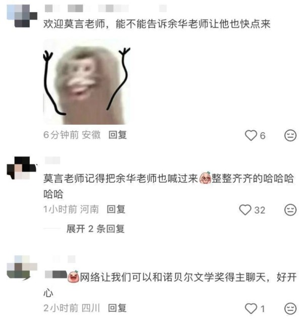 评论区呼声很高的是让莫言老师把余华老师也拉进来,一起与大家交流。