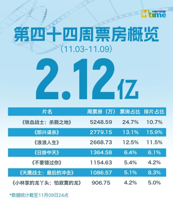 时光网讯 2025年第44周(11月3日-11月9日)内地电影总票房2.12亿,环比上周下滑2%,从10月中旬开始,内地单周票房已经连续4周,维持在单周2亿左右的水平。