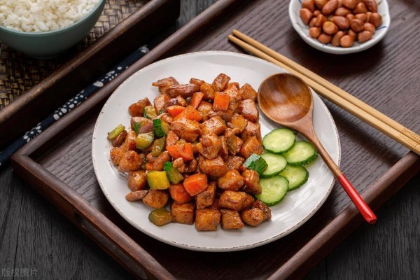 宫保鸡丁是成都的一道传统名菜。鸡肉丁搭配花生米、干辣椒等食材炒制而成,口感鲜嫩香辣,是川菜中的经典之作。