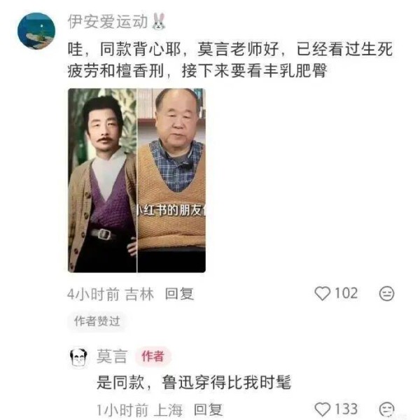 对于被网友发现穿着鲁迅同款毛衣,莫言谦虚表示:“鲁迅穿得比我时髦”。