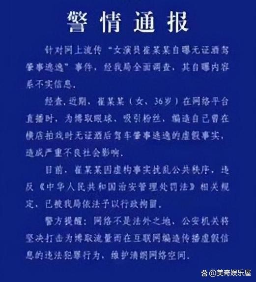 崔漫莉在直播中的“酒后肇事逃逸”事件成为一大焦点。她本意想通过虚构一桩轶事吸引眼球,结果却被警方揭穿,原来这一事件完全是捏造。