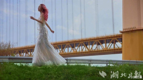 薛凯琪在杨泗港长江大桥下拍摄了一组惊艳大片,明亮的“金秋黄”桥身映衬着白色鱼尾裙,宛如人鱼公主。