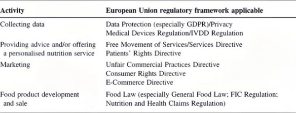 例如,提供个性化营养可能需要使用设备,例如用于收集血液样本或口腔细胞拭子的工具。在营养个性化中使用的一些设备和技术将符合医疗设备的资格,因此将受欧盟法律的约束。目前,欧盟正处于新的医疗器械指令之间的过渡阶段,之前的指令已于2017年4月被两个新法规取代。这两项新法规本应在2020年5月(医疗器械)和2022年5月(体外诊断设备)的过渡期后适用,然而,由于新冠危机,这一计划推迟了一年。新的《医疗器械条例》包括将疾病预测作为医疗目的,因此意味着用于个性化营养服务的工具如果用于预测一个人的疾病易感性,则将受到立法的保护。