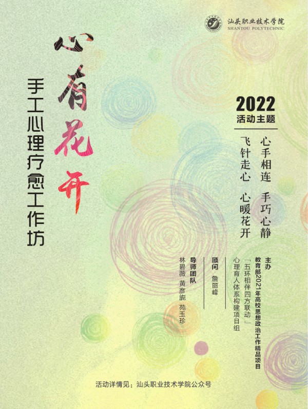 基于手工的心理疗愈功能,潮汕钩花的技艺传承,我们启动“心有花开”手工心理疗愈工作坊的探索,旨在组织学生参与潮汕非遗技艺手钩花的的活动,让学生通过手工学习与创造,掌握新技艺,疏导情绪、获得成长,获得平静温暖的力量,培育属于自己的心灵花园。将心理健康维护、潮汕文化传承,劳动技艺培养、审美趣味提升结合起来,探索富于地域特色与我院校园文化特点的新颖的心理疗愈活动。