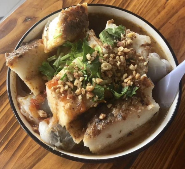 钦州水糕是出了名的传统特色小吃,小时候早餐就常吃,记得小时候在乡下,听到有推单车叫卖水糕,小贩车上载着一屉一屉的水糕,底下是煤球炉,要多少盛多少,用大剪刀咔咔剪碎,淋上梅菜碎肉汁,自己加点酱油、蒜泥等酱料,软糯中带着米香,再好吃不过了。