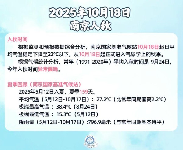 南京,秋意渐浓!历经一场迟来的夏秋交替,此刻,终于迎来了秋天的官方宣告。 经过对监测和预报数据的综合分析,南京国家基准气候站显示,自10月18日起,日平均气温已稳定降至22℃以下,标志着南京正式进入气象学上的秋季。回顾历史数据,我们发现常年(1991-2020年)的平均入秋时间为9月24日,而今年入秋的时间明显偏晚。