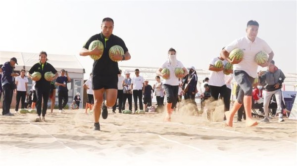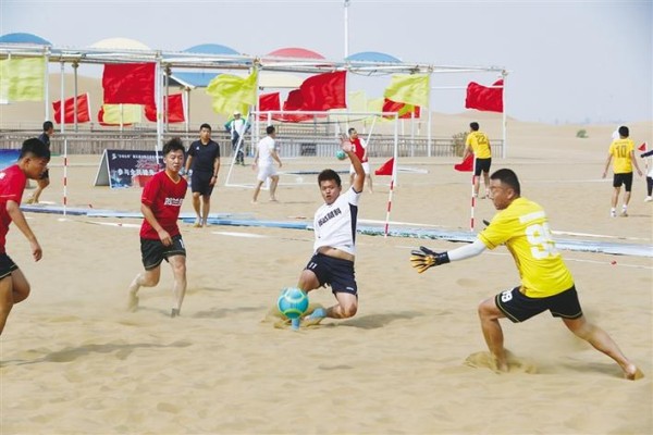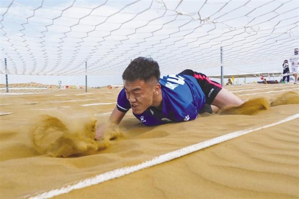 在沙漠排球项目比赛中,运动员们在金色柔软的细沙上跳跃、翻滚,大家默契配合、激烈对抗,时而跃身救球、时而跳起扣杀、时而奋力拦网,一个个精彩瞬间点燃了现场观众的热情。