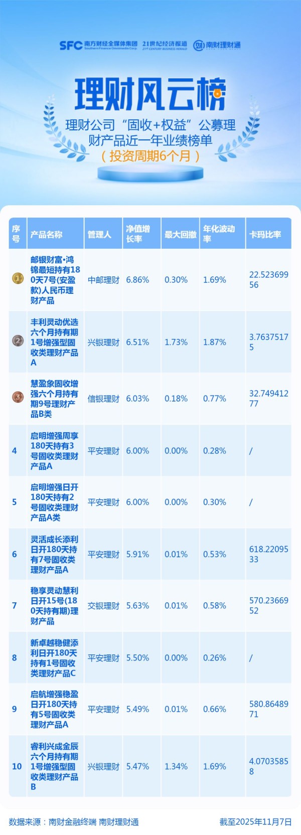 数据说明:产品统计范围为理财公司发行的投资周期在6个月的公募“固收+权益”产品,统计截止日期为2025年11月7日,统计区间为近1年。榜单排名来自理财通AI全自动化实时排名,如您对数据有疑问,请在文末联系助理进一步核实。