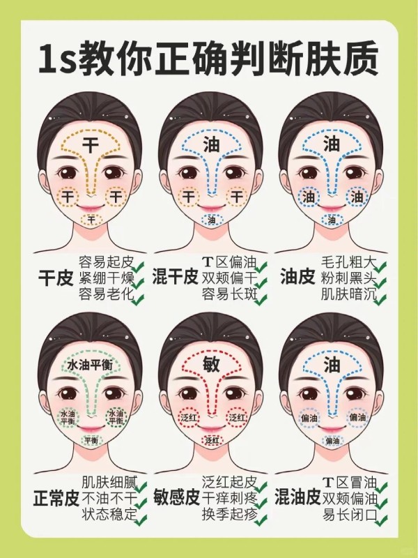 1. 干性皮肤:注重保湿,选用滋润型护肤品,避免使用泡沫型洗面奶。
