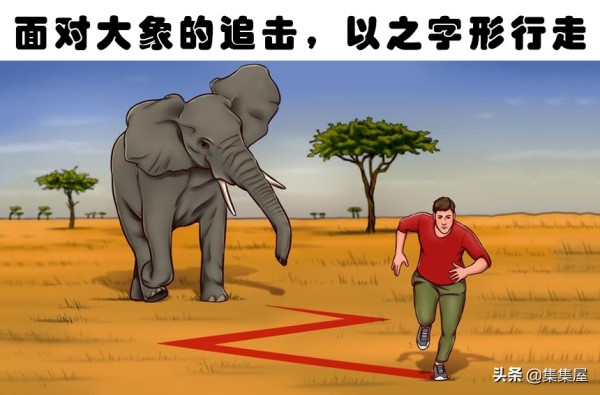如果遇到了凶猛的大象,你必须做出非常快速的反应来拯救自己。因为大象的速度并不慢,奔跑起来可以达到每小时40公里的速度。面对狂奔的大象,你应该以之字形的方式逃跑,并且对大象大喊大叫,紧接着趁机躲在一个巨大物体的背后。这么做有效的原因在于大象转弯的速度是很慢的。