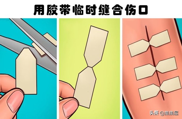 如果你身上的切割伤口有一些大,那代表你应该尽快缝合伤口,但你可能需要等待一些时间才能够到达医院,从而接受医疗救助。这种情况下,你就可以尝试使用简单的胶带来制造一个简易的缝合工具。尝试对胶带的边缘进行剪裁,把它贴在伤口上,然后尽快到达医院。