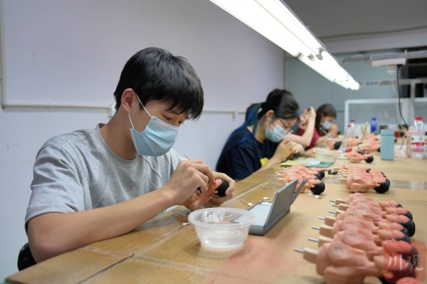 手办模玩生产车间里,企业培训年轻人参与涂装工作。